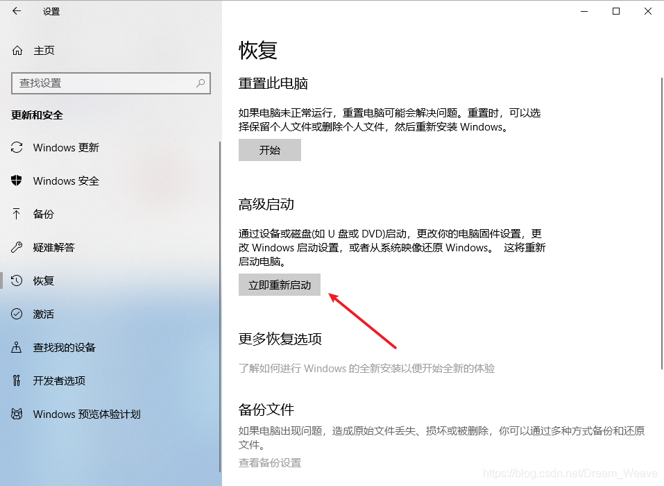 弹出设置对话框,点击“恢复”,再点击“高级启动”项下的“立即重启”按钮