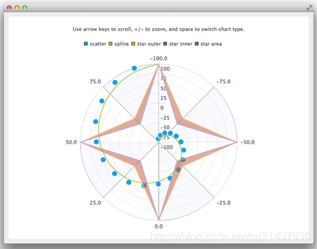 通过使用QPolarChart类(QChart类的专门化)或polar ChartView QML类型(ChartView类型的专门化),某些图表组件也可以表示为极坐标图。