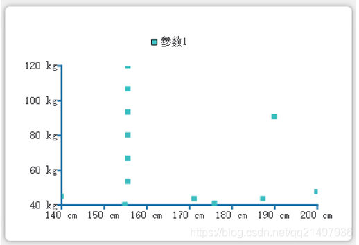 void ScatterChartWidget::testDemo1() { _pChart->removeAllSeries(); // 散点图:参数1 QScatterSeries *_pScatterSeries = new QScatterSeries(); _pScatterSeries->setName("参数1"); _pScatterSeries->setBrush(QColor(59, 189, 191)); _pScatterSeries->setBorderColor(QColor(0, 0, 0, 0)); _pScatterSeries->setMarkerShape(QScatterSeries::MarkerShapeRectangle); _pScatterSeries->setMarkerSize(6.0); _pScatterSeries->append(164.1, 50.6); // ...do something _pScatterSeries->append(150.5, 110); _pChart->addSeries(_pScatterSeries); // 轴的颜色 QColor colorAxis = QColor(24, 111, 167); // 水平轴 QValueAxis *_pValueAxisH = new QValueAxis(); _pValueAxisH->setLinePen(QPen(colorAxis, 2)); _pValueAxisH->setGridLineVisible(false); // 定义轴范围 _pValueAxisH->setRange(140, 200); // 定义轴的TickCount _pValueAxisH->setTickCount(7); // 定义轴的标签格式 _pValueAxisH->setLabelFormat("%d cm"); _pChart->addAxis(_pValueAxisH, Qt::AlignBottom); // 垂直轴 QValueAxis *_pValueAxisV = new QValueAxis(); _pValueAxisV->setLinePen(QPen(colorAxis, 2)); _pValueAxisV->setGridLineVisible(false); // 定义轴范围 _pValueAxisV->setRange(40, 120); // 定义轴的TickCount _pValueAxisV->setTickCount(5); // 定义轴的标签格式 _pValueAxisV->setLabelFormat("%d kg"); _pChart->addAxis(_pValueAxisV, Qt::AlignLeft); }