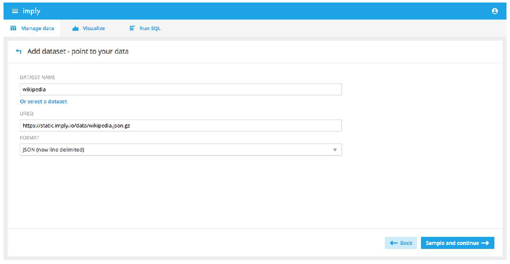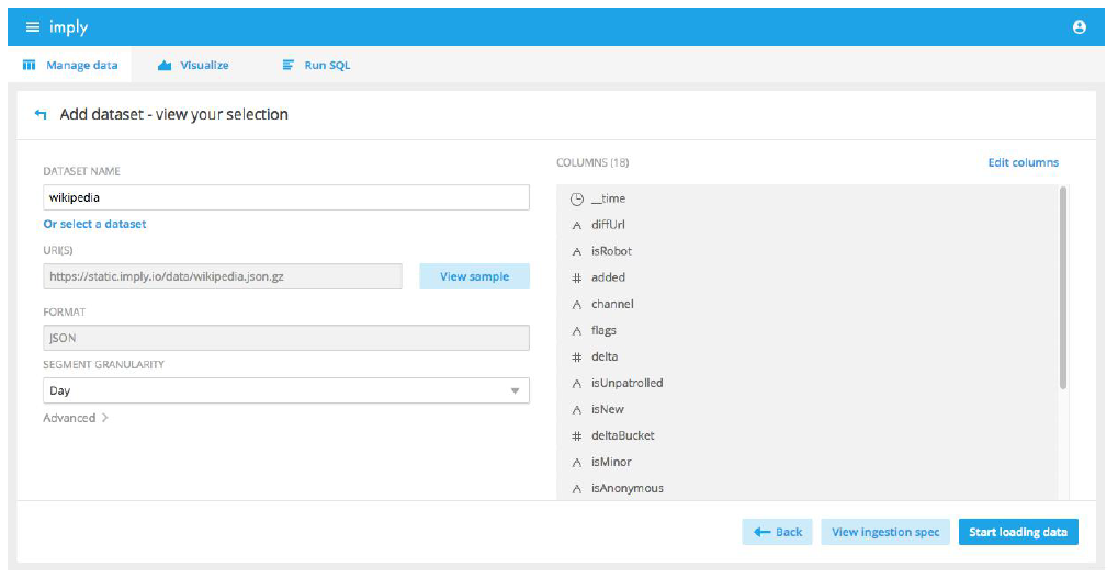 Wikipedia 示例使用Http 数据加载器从URI 路径读取数据,格式为json。可以通过点击采样并继续,对文件前几行的数据进行采样,以确保它是可解析的数据。
