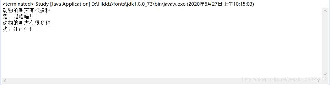 class Animal { public void hobby() { System.out.println("动物的叫声有很多种!"); } } class Cat extends Animal { public void hobby() { //子类重写父类的 hobby 方法 super.hobby(); //要想调用父类中被重写的方法,必须使用 super 关键字 System.out.println("猫:喵喵喵!"); } } class Dog extends Animal { //Dog 子类的理解和上面的 Cat 子类是一样的 public void hobby() { super.hobby(); System.out.println("狗:汪汪汪!"); } } public class Study { public static void main(String[] args) { Animal a=new Cat(); //父类声明对象,子类实例化对象,即向上转型 a.hobby(); Animal b=new Dog(); //父类声明对象,子类实例化对象,即向上转型 b.hobby(); } }