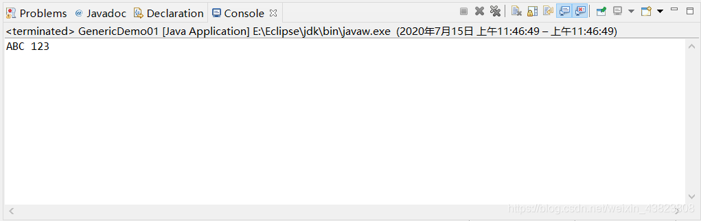 import java.util.*; public class GenericDemo01 { public static void main(String[] args) { ArrayList arraylist=new ArrayList();//集合不使用泛型 //向集合中添加数据,用于测试,这里添加了String类型和int类型的数据 arraylist.add("ABC"); arraylist.add(123); Iterator iterator=arraylist.iterator(); while(iterator.hasNext()) {//取出的元素的类型默认是Object类型 System.out.print(iterator.next() + " "); } } }