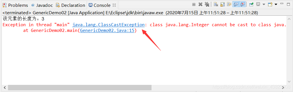 import java.util.*; public class GenericDemo02 { public static void main(String[] args) { ArrayList arraylist=new ArrayList(); arraylist.add("ABC"); arraylist.add(123); Iterator iterator=arraylist.iterator(); while(iterator.hasNext()) { //取出的数据,默认是Object类型 Object obj=iterator.next(); /*假如想使用String类特有的length()方法来获取字符串的长度,是不可以的 需要将Object类型向下转型为String类型才能使用它的特有方法 但是集合里面还有数据类型为Integer的数据,所以不能进行向下转型为String类型, 如果强行转换,那么在运行时会抛出ClassCastException异常*/ String str=(String)obj; System.out.println("该元素的长度为:" + str.length()); } } }