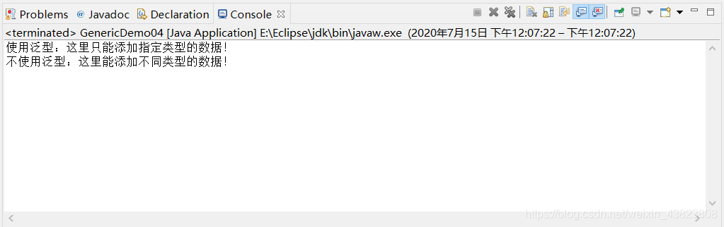 class GenericClass<E> { private E name; public void setName(E name) { this.name=name; } public E getName() { return this.name; } } public class GenericDemo04 { public static void main(String[] args) { //使用泛型,限定该类的数据类型为String类 GenericClass<String> name1=new GenericClass<String>(); name1.setName("使用泛型:这里只能添加指定类型的数据!"); String str1=name1.getName(); System.out.println(str1); //不使用泛型,该类的数据类型默认为Object类 GenericClass name2=new GenericClass(); name2.setName("不使用泛型:这里能添加不同类型的数据!"); Object obj1=name2.getName(); System.out.println(obj1); } }