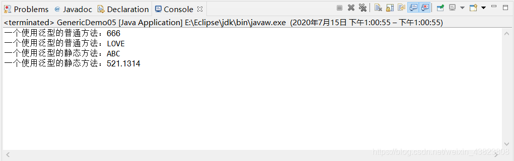 class GenericMethod { public <W> String method1(W w) { return "一个使用泛型的普通方法:" + w; } public static <Z> String method2(Z z) { return "一个使用泛型的静态方法:" + z; } } public class GenericDemo05 { public static void main(String[] args) { GenericMethod use=new GenericMethod();//创建一个类对象 /*调用包含泛型的普通方法 对应的普通方法为:public <Integer> String method1(Integer 666),w=666*/ System.out.println(use.method1(666)); //对应的普通方法为:public <String> String method1(String LOVE),w=LOVE System.out.println(use.method1("LOVE")); /*调用包含泛型的静态方法 虽然可以通过对象来调用,但还是推荐使用类进行调用 对应的静态方法为:public static <String> String method2(String ABC),z=ABC*/ System.out.println(GenericMethod.method2("ABC")); //对应的静态方法为:public static <Double> String method2(Double 521.1314),z=521.1314 System.out.println(GenericMethod.method2("521.1314")); } }