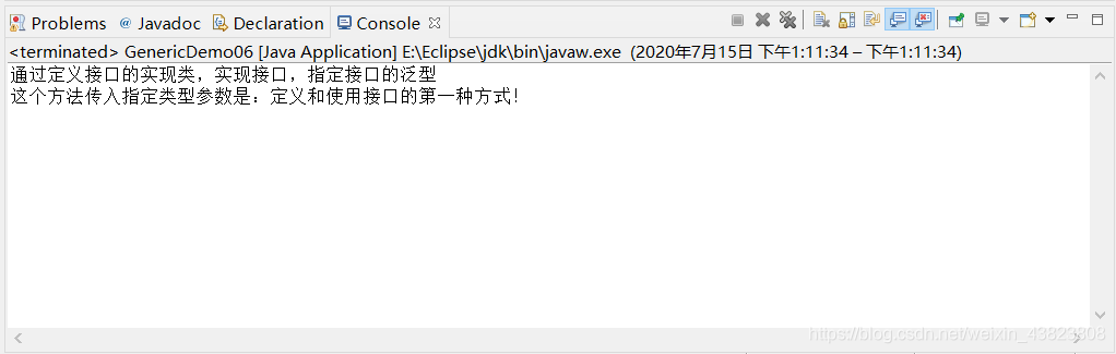 //博主在这里有点懒,将接口和实现接口的类都写在了一个.java源文件中 //推荐大家将接口和其他的类都单独的写在一个.java源文件中 interface GenericInterface<I> { public void method(I i);//接口中的一个抽象方法 } class Genericing implements GenericInterface<String> { public void method(String s) { System.out.println("通过定义接口的实现类,实现接口,指定接口的泛型\n" + "这个方法传入指定类型参数是:" + s); } } public class GenericDemo06 { public static void main(String[] args) { Genericing generic=new Genericing(); generic.method("定义和使用接口的第一种方式!"); } }