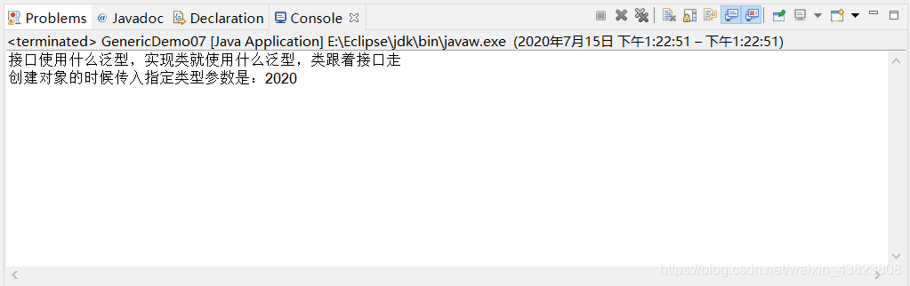 interface GenericInterface01<I> { public void method(I i); } class Genericing01<I> implements GenericInterface01<I> { public void method(I i) { System.out.println("接口使用什么泛型,实现类就使用什么泛型,类跟着接口走\n" + "创建对象的时候传入指定类型参数是:" + i); } } public class GenericDemo07 { public static void main(String[] args) { Genericing01 generic=new Genericing01(); generic.method(2020); } }