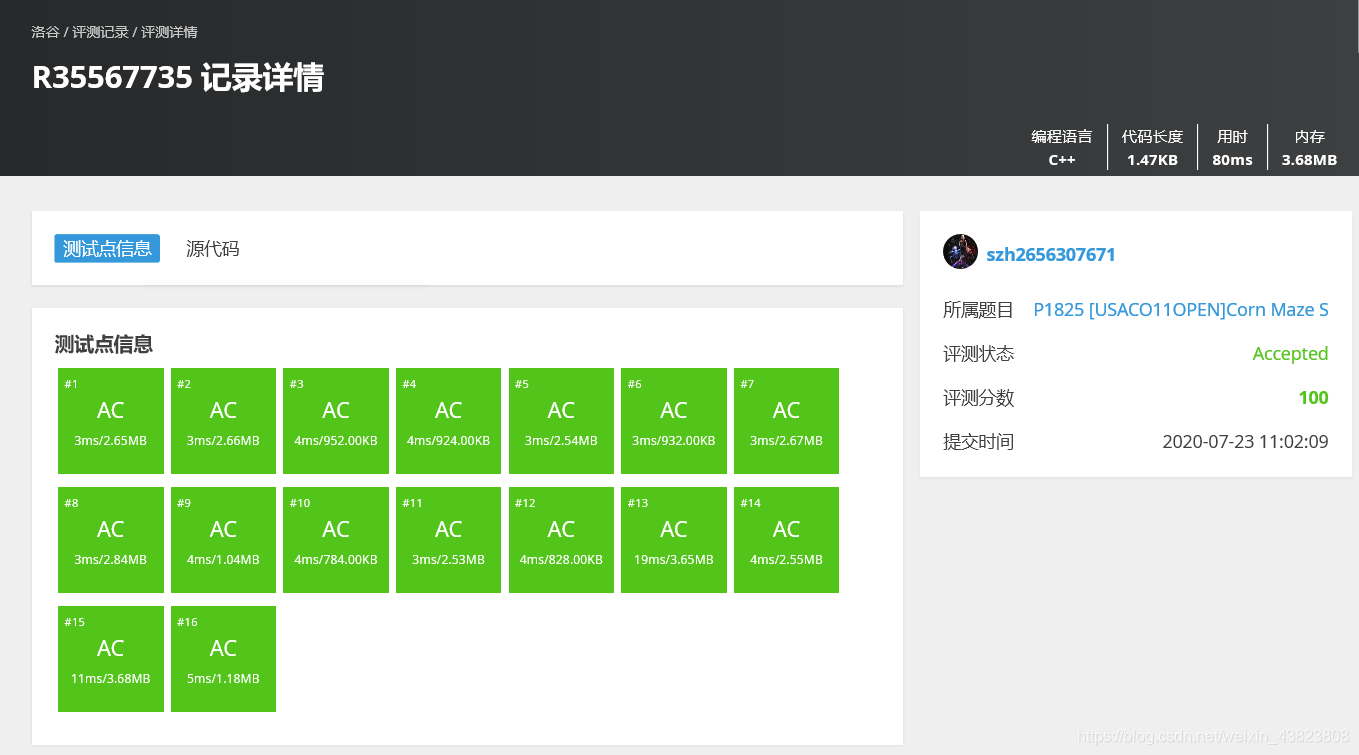 #include<bits/stdc++.h> using namespace std; #define N 510 char s[N][N];//存入地图 int a[N][N];//对地图进行相应的转换 bool vis[N][N];//标记数组 int n,m,sx,sy,ex,ey,mx,my,xx,yy,head,tail; int dx[]={0,0,1,-1};//两个方向数组 int dy[]={1,-1,0,0}; struct node { int x,y,step; }q[N*N];//模拟队列 void find(int x,int y) { for(int i=1;i<=n;i++) { for(int j=1;j<=m;j++) { if(!(i==x&&j==y)) {//搜索一个传送门对应的另一个传送门的位置 if(a[i][j]==a[x][y]) { xx=i;//获取另一个传送门的坐标 yy=j; return ; } } } } } int main() { scanf("%d %d",&n,&m); for(int i=1;i<=n;i++) { for(int j=1;j<=m;j++) { scanf(" %c",&s[i][j]);//%前面的空格确保地图完整输入 //将可以走的地方都用a数组标记为1,不能走的标记为0 if(s[i][j]=='.') {//草地可以走 a[i][j]=1; }else if(s[i][j]=='@') {//起点可以走 sx=i; sy=j; a[i][j]=1; }else if(s[i][j]=='=') {//出口可以走 ex=i; ey=j; a[i][j]=1; }else if(s[i][j]>='A'&&s[i][j]<='Z') {//传送门可以走 a[i][j]=s[i][j]; }else {//玉米格子不能走 a[i][j]=0; } } } memset(vis,false,sizeof(vis));//清空标记数组 vis[sx][sy]=true;//对起点进行标记 head=tail=1;//队头队尾初始化 q[head].x=sx;//起点入队 q[head].y=sy; q[head].step=0;//步数为0 tail++;//队尾向后移动一格 while(head<tail) {//保证队列不为空 if(a[q[head].x][q[head].y]>='A'&&a[q[head].x][q[head].y]<='Z') {//判断此时是否走到传送门 find(q[head].x,q[head].y);//寻找另一个传送门的坐标 q[head].x=xx;//位置坐标更新为另一个传送门 q[head].y=yy; } for(int i=0;i<4;i++) {//四个方向搜索 int tx=q[head].x+dx[i]; int ty=q[head].y+dy[i]; //不越界,这个点可以走,并且没有被访问过 if(tx>=1&&tx<=n&&ty>=1&&ty<=m&&a[tx][ty]!=0&&vis[tx][ty]==false) { vis[tx][ty]=true;//标记该点 q[tail].x=tx;//该点入队 q[tail].y=ty; q[tail].step=q[head].step+1;//步数+1 if(tx==ex&&ty==ey) {//走到出口 printf("%d\n",q[tail].step);//输出此时的步数 return 0;//直接返回 } tail++;//新的点入队,队尾向后移动一格 } } head++;//没有走到出口,队头向后移动一格,继续下一个点的搜索 } return 0; }