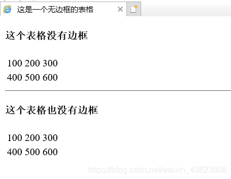 <!DOCTYPE html> <html lang="en"> <head> <meta charset="utf-8"> <title>这是一个无边框的表格</title> </head> <body> <h4>这个表格没有边框</h4> <table> <tr> <td>100</td> <td>200</td> <td>300</td> </tr> <tr> <td>400</td> <td>500</td> <td>600</td> </tr> </table> <hr/> <h4>这个表格也没有边框</h4> <table border="0"> <tr> <td>100</td> <td>200</td> <td>300</td> </tr> <tr> <td>400</td> <td>500</td> <td>600</td> </tr> </table> </body> </html>