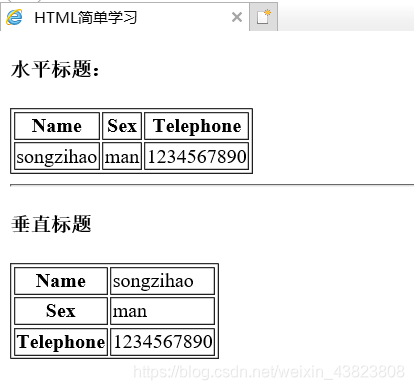 <!DOCTYPE html> <html lang="en"> <head> <meta charset="utf-8"> <title>HTML简单学习</title> </head> <body> <h4>水平标题:</h4> <table border="1"> <tr> <th>Name</th> <th>Sex</th> <th>Telephone</th> </tr> <tr> <td>songzihao</td> <td>man</td> <td>1234567890</td> </tr> </table> <hr/> <h4>垂直标题</h4> <table border="1"> <tr> <th>Name</th> <td>songzihao</td> </tr> <tr> <th>Sex</th> <td>man</td> </tr> <tr> <th>Telephone</th> <td>1234567890</td> </tr> </table> </body> </html>