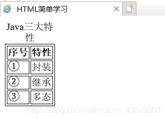 <!DOCTYPE html> <html lang="en"> <head> <meta charset="utf-8"> <title>HTML简单学习</title> </head> <body> <table border="1"> <caption>Java三大特性</caption> <tr> <th>序号</th> <th>特性</th> </tr> <tr> <td>①</td> <td>封装</td> </tr> <tr> <td>②</td> <td>继承</td> </tr> <tr> <td>③</td> <td>多态</td> </tr> </table> </body> </html>