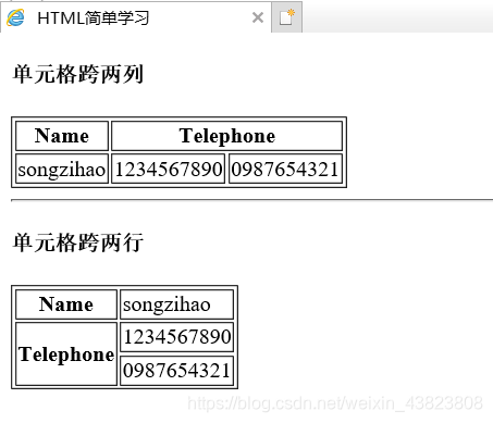 <!DOCTYPE html> <html lang="en"> <head> <meta charset="utf-8"> <title>HTML简单学习</title> </head> <body> <h4>单元格跨两列</h4> <table border="1"> <tr> <th>Name</th> <th colspan="2">Telephone</th> </tr> <tr> <td>songzihao</td> <td>1234567890</td> <td>0987654321</td> </tr> </table> <hr/> <h4>单元格跨两行</h4> <table border="1"> <tr> <th>Name</th> <td>songzihao</td> </tr> <tr> <th rowspan="2">Telephone</th> <td>1234567890</td> </tr> <tr> <td>0987654321</td> </tr> </table> </body> </html>