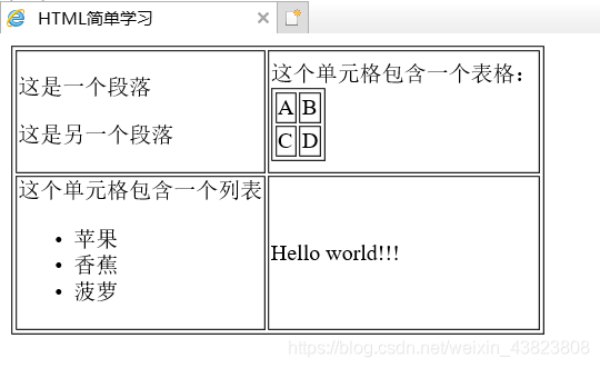 <!DOCTYPE html> <html lang="en"> <head> <meta charset="utf-8"> <title>HTML简单学习</title> </head> <body> <table border="1"> <tr> <td> <p>这是一个段落</p> <p>这是另一个段落</p> </td> <td>这个单元格包含一个表格: <table border="1"> <tr> <td>A</td> <td>B</td> </tr> <tr> <td>C</td> <td>D</td> </tr> </table> </td> </tr> <tr> <td>这个单元格包含一个列表 <ul> <li>苹果</li> <li>香蕉</li> <li>菠萝</li> </ul> </td> <td>Hello world!!!</td> </tr> </table> </body> </html>