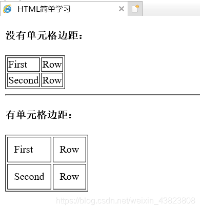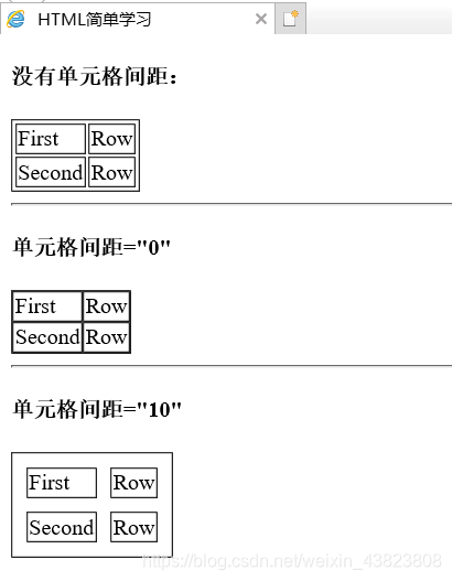 <!DOCTYPE html> <html lang="en"> <head> <meta charset="utf-8"> <title>HTML简单学习</title> </head> <body> <h4>没有单元格间距:</h4> <table border="1"> <tr> <td>First</td> <td>Row</td> </tr> <tr> <td>Second</td> <td>Row</td> </tr> </table> <hr/> <h4>单元格间距="0"</h4> <table border="1" cellspacing="0"> <tr> <td>First</td> <td>Row</td> </tr> <tr> <td>Second</td> <td>Row</td> </tr> </table> <hr/> <h4>单元格间距="10"</h4> <table border="1" cellspacing="10"> <tr> <td>First</td> <td>Row</td> </tr> <tr> <td>Second</td> <td>Row</td> </tr> </table> </body> </html>