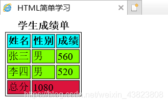 <!DOCTYPE html> <html lang="en"> <head> <meta charset="utf-8"> <title>HTML简单学习</title> <style> thead {background-color: aqua;} tbody {background-color: chartreuse;} tfoot {background-color: crimson;} </style> </head> <body> <table border="1"> <caption><strong>学生成绩单</strong></caption> <thead> <tr> <th>姓名</th> <th>性别</th> <th>成绩</th> </tr> </thead> <tbody> <tr> <td>张三</td> <td>男</td> <td>560</td> </tr> <tr> <td>李四</td> <td>男</td> <td>520</td> </tr> </tbody> <tfoot> <tr> <td>总分</td> <td colspan="2">1080</td> </tr> </tfoot> </table> </body> </html>