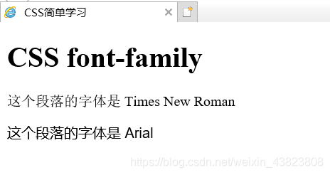<!DOCTYPE html> <html lang="en"> <head> <meta charset="utf-8"> <title>CSS简单学习</title> <style type="text/css"> p.serif {font-family: 'Times New Roman', Times, serif;} p.sansserif {font-family: Arial, Helvetica, sans-serif;} </style> </head> <body> <h1>CSS font-family</h1> <p class="serif">这个段落的字体是 Times New Roman</p> <p class="sansserif">这个段落的字体是 Arial</p> </body> </html>