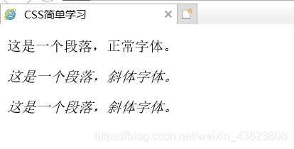 <!DOCTYPE html> <html lang="en"> <head> <meta charset="utf-8"> <title>CSS简单学习</title> <style type="text/css"> p.normal {font-style: normal;} p.italic {font-style: italic;} p.oblique {font-style: oblique} </style> </head> <body> <p class="normal">这是一个段落,正常字体。</p> <p class="italic">这是一个段落,斜体字体。</p> <p class="oblique">这是一个段落,斜体字体。</p> </body> </html>