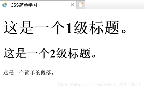 <!DOCTYPE html> <html lang="en"> <head> <meta charset="utf-8"> <title>CSS简单学习</title> <style type="text/css"> h1 {font-size: 40px;} h2 {font-size: 30px;} p {font-size: 14px;} /* h1 {font-size: 2.5em;} h2 {font-size: 1.875em;} p {font-size: 0.875em;} */ </style> </head> <body> <h1>这是一个1级标题。</h1> <h2>这是一个2级标题。</h2> <p>这是一个简单的段落。</p> </body> </html>