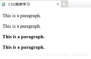 <!DOCTYPE html> <html lang="en"> <head> <meta charset="utf-8"> <title>CSS简单学习</title> <style type="text/css"> p.normal {font-weight: normal;} p.light {font-weight: lighter;} p.thick {font-weight: bold;} p.thicker {font-weight: 900;} </style> </head> <body> <p class="normal">This is a paragraph.</p> <p class="light">This is a paragraph.</p> <p class="thick">This is a paragraph.</p> <p class="thicker">This is a paragraph.</p> </body> </html>