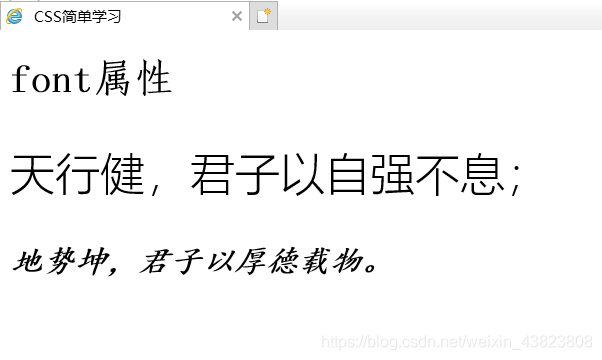 <!DOCTYPE html> <html lang="en"> <head> <meta charset="utf-8"> <title>CSS简单学习</title> <style type="text/css"> p.example1 {font: normal lighter 36px arial, sans-serif;} p.example2 {font: italic bold 25px "楷体", serif;} </style> </head> <body> <h1 style="font-family: '仿宋';">font属性</h1> <p class="example1">天行健,君子以自强不息;</p> <p class="example2">地势坤,君子以厚德载物。</p> </body> </html>