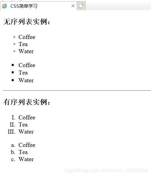 <!DOCTYPE html> <html lang="en"> <head> <meta charset="utf-8" /> <title>CSS简单学习</title> <style type="text/css"> ul.a {list-style-type: circle;} ul.b {list-style-type: square;} ol.c {list-style-type: upper-roman;} ol.d {list-style-type: lower-alpha;} </style> </head> <body> <h3>无序列表实例:</h3> <ul class="a"> <li>Coffee</li> <li>Tea</li> <li>Water</li> </ul> <ul class="b"> <li>Coffee</li> <li>Tea</li> <li>Water</li> </ul><hr /> <h3>有序列表实例:</h3> <ol class="c"> <li>Coffee</li> <li>Tea</li> <li>Water</li> </ol> <ol class="d"> <li>Coffee</li> <li>Tea</li> <li>Water</li> </ol> </body> </html>