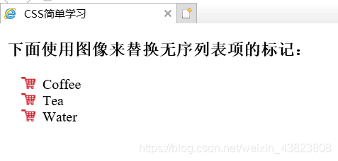 <!DOCTYPE html> <html lang="en"> <head> <meta charset="utf-8"> <title>CSS简单学习</title> <style type="text/css"> ul {list-style-image: url(./img/images/buy.png);} </style> </head> <body> <h3>下面使用图像来替换无序列表项的标记:</h3> <ul> <li>Coffee</li> <li>Tea</li> <li>Water</li> </ul> </body> </html>