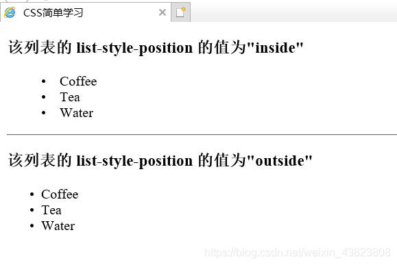 <!DOCTYPE html> <html lang="en"> <head> <meta charset="utf-8"> <title>CSS简单学习</title> <style type="text/css"> ul.inside {list-style-position: inside;} ul.outside {list-style-position: outside;} </style> </head> <body> <h3>该列表的 list-style-position 的值为"inside"</h3> <ul class="inside"> <li>Coffee</li> <li>Tea</li> <li>Water</li> </ul><hr /> <h3>该列表的 list-style-position 的值为"outside"</h3> <ul class="outside"> <li>Coffee</li> <li>Tea</li> <li>Water</li> </ul> </body> </html>