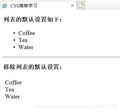 <!DOCTYPE html> <html lang="en"> <head> <meta charset="utf-8"> <title>CSS简单学习</title> <style type="text/css"> ul.ex { list-style-type: none; /* padding 和 margin 分别设置了内、外边距 */ padding: 5px; margin: 0px; } </style> </head> <body> <p><b>列表的默认设置如下:</b></p> <ul> <li>Coffee</li> <li>Tea</li> <li>Water</li> </ul><hr /> <p><b>移除列表的默认设置:</b></p> <ul class="ex"> <li>Coffee</li> <li>Tea</li> <li>Water</li> </ul> </body> </html>