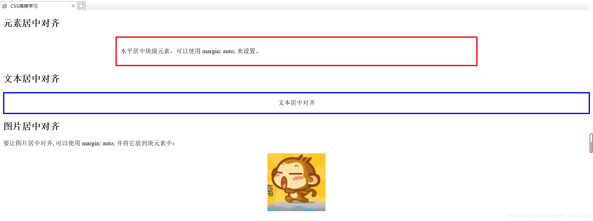 <!DOCTYPE html> <html lang="en"> <head> <meta charset="utf-8" /> <title>CSS简单学习</title> <style type="text/css"> .center1 { margin: auto; padding: 10px; width: 60%; border: 3px solid red; } .center2 { text-align: center; border: 3px solid blue; } img { display: block; margin: 0 auto; } </style> </head> <body> <h2>元素居中对齐</h2> <div class="center1"> <p>水平居中块级元素,可以使用 margin: auto; 来设置。</p> </div> <h2>文本居中对齐</h2> <div class="center2"> <p>文本居中对齐</p> </div> <h2>图片居中对齐</h2> <p>要让图片居中对齐, 可以使用 margin: auto; 并将它放到块元素中:</p> <img src="img/images/tx.jpg" alt="表情图" width="150" height="150" /> </body> </html>