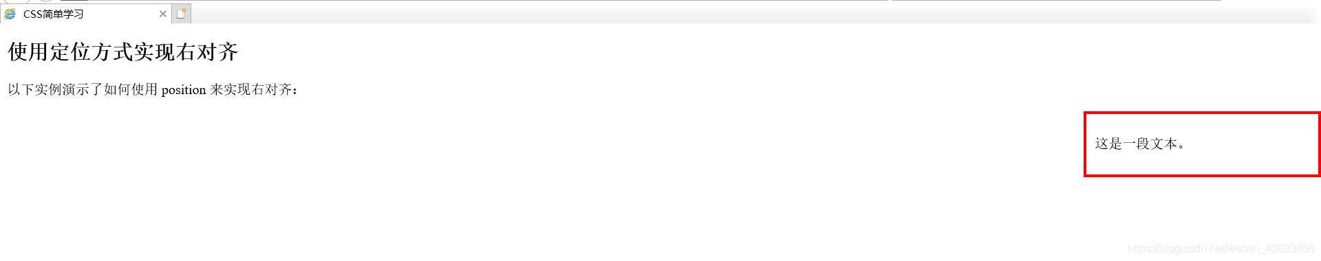 <!DOCTYPE html> <html lang="en"> <head> <meta charset="utf-8"> <title>CSS简单学习</title> <style type="text/css"> .right { position: absolute; right: 0px; width: 250px; border: 3px solid red; padding: 10px; } </style> </head> <body> <h2>使用定位方式实现右对齐</h2> <p>以下实例演示了如何使用 position 来实现右对齐:</p> <div class="right"> <p>这是一段文本。</p> </div> </body> </html>