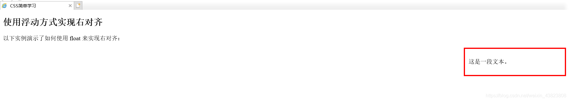 <!DOCTYPE html> <html lang="en"> <head> <meta charset="utf-8"> <title>CSS简单学习</title> <style type="text/css"> .right { float: right; width: 250px; border: 3px solid red; padding: 10px; } </style> </head> <body> <h2>使用浮动方式实现右对齐</h2> <p>以下实例演示了如何使用 float 来实现右对齐:</p> <div class="right"> <p>这是一段文本。</p> </div> </body> </html>