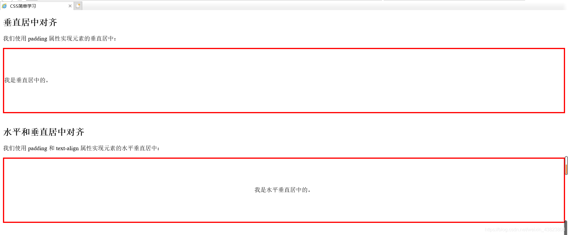 <!DOCTYPE html> <html lang="en"> <head> <meta charset="utf-8"> <title>CSS简单学习</title> <style type="text/css"> .center1 { padding: 60px 0; border: 3px solid red; } .center2 { padding: 60px 0; border: 3px solid red; text-align: center; } </style> </head> <body> <h2>垂直居中对齐</h2> <p>我们使用 padding 属性实现元素的垂直居中:</p> <div class="center1"> <p>我是垂直居中的。</p> </div><br /> <h2>水平和垂直居中对齐</h2> <p>我们使用 padding 和 text-align 属性实现元素的水平垂直居中:</p> <div class="center2"> <p>我是水平垂直居中的。</p> </div> </body> </html>