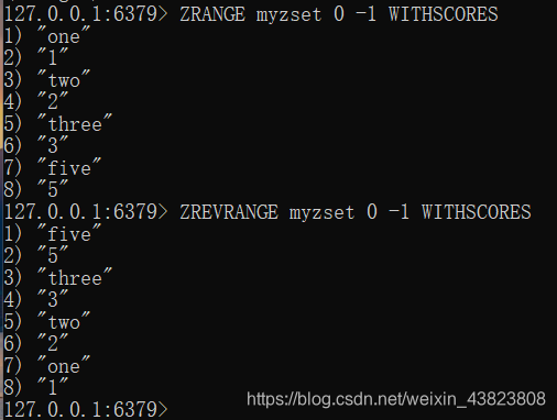 redis 127.0.0.1:6379> ZREVRANGE key start stop [WITHSCORES]