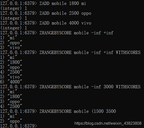 redis 127.0.0.1:6379> ZRANGEBYSCORE key min max [WITHSCORES] [LIMIT offset count]