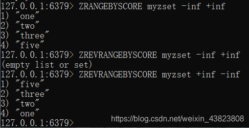 redis 127.0.0.1:6379> ZREVRANGEBYSCORE key max min [WITHSCORES] [LIMIT offset count]