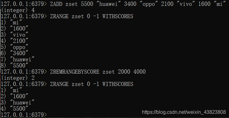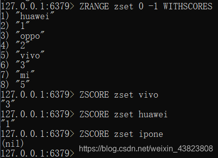 返回的每个元素都是一个有序集合元素,一个有序集合元素由一个成员(member)和一个分值(score)组成。