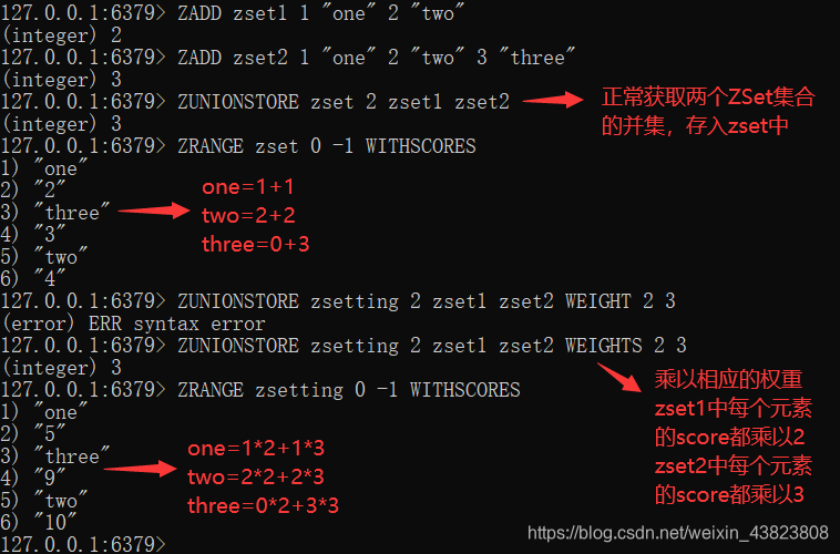 redis 127.0.0.1:6379> ZUNIONSTORE destination numkeys key [key ...] [WEIGHTS weight [weight ...]] [AGGREGATE SUM|MIN|MAX]