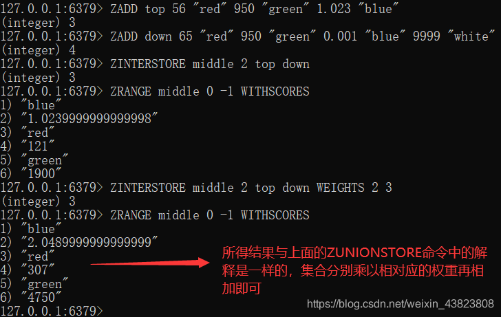 redis 127.0.0.1:6379> ZINTERSTORE destination numkeys key [key ...] [WEIGHTS weight [weight ...]] [AGGREGATE SUM|MIN|MAX]