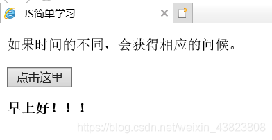 <!DOCTYPE html> <html lang="en"> <head> <meta charset="utf-8" /> <title>JS简单学习</title> </head> <body> <p>如果时间的不同,会获得相应的问候。</p> <button type="button" onclick="myFunction()">点击这里</button> <p id="demo"></p> <script> function myFunction() { var x=""; var time=new Date().getHours(); if(time<12) { x="<b>早上好!!!</b>"; }else if(time>=12 && time<18) { x="<b>下午好!!!</b>"; }else{ x="<b>晚上好!!!</b>"; } document.getElementById("demo").innerHTML=x; } </script> </body> </html>