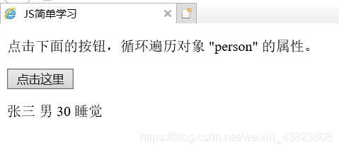 <!DOCTYPE html> <html lang="en"> <head> <meta charset="utf-8" /> <title>JS简单学习</title> </head> <body> <p>点击下面的按钮,循环遍历对象 "person" 的属性。</p> <button type="button" onclick="myFunction()">点击这里</button> <p id="demo"></p> <script> function myFunction() { var x; var str=""; var person={姓名:"张三",性别:"男",年龄:30,爱好:"睡觉"}; for(x in person) { str=str + person[x] + " "; } document.getElementById("demo").innerHTML=str; } </script> </body> </html>