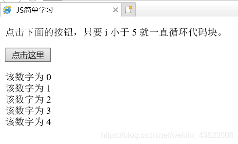 <!DOCTYPE html> <html lang="en"> <head> <meta charset="utf-8" /> <title>JS简单学习</title> </head> <body> <p>点击下面的按钮,只要 i 小于 5 就一直循环代码块。</p> <button type="button" onclick="myFunction()">点击这里</button> <p id="demo"></p> <script> function myFunction() { var i=0,x=""; while(i<5) { x=x + "该数字为 " + i + "<br />"; i++; } /* 转为do-while循环如下: do{ x=x + "该数字为 " + i + "<br />"; i++; }while(i<5) */ document.getElementById("demo").innerHTML=x; } </script> </body> </html>