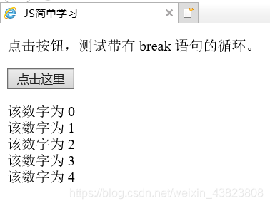 <!DOCTYPE html> <html lang="en"> <head> <meta charset="utf-8"> <title>JS简单学习</title> </head> <body> <p>点击按钮,测试带有 break 语句的循环。</p> <button type="button" onclick="myFunction()">点击这里</button> <p id="demo"></p> <script> function myFunction() { var x="",i=0; for(i=0;i<10;i++) { if(i==5) { break; } x=x + "该数字为 " + i + "<br />"; } document.getElementById("demo").innerHTML=x; } </script> </body> </html>