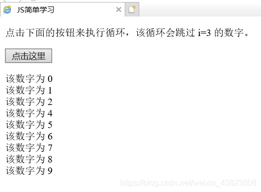 <!DOCTYPE html> <html lang="en"> <head> <meta charset="utf-8"> <title>JS简单学习</title> </head> <body> <p>点击下面的按钮来执行循环,该循环会跳过 i=3 的数字。</p> <button type="button" onclick="myFunction()">点击这里</button> <p id="demo"></p> <script> function myFunction() { var x="",i=0; for(i=0;i<10;i++) { if(i==3) { continue; } x=x + "该数字为 " + i + "<br />"; } document.getElementById("demo").innerHTML=x; } </script> </body> </html>