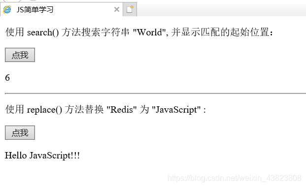 <!DOCTYPE html> <html lang="en"> <head> <meta charset="utf-8" /> <title>JS简单学习</title> </head> <body> <p>使用 search() 方法搜索字符串 "World", 并显示匹配的起始位置:</p> <button type="button" onclick="myFunction()">点我</button> <p id="demo"></p> <script> function myFunction() { var str="Hello World!!!"; var n=str.search(/World/i); //var n=str.search("World"); document.getElementById("demo").innerHTML=n; } </script> <hr /> <p>使用 replace() 方法替换 "Redis" 为 "JavaScript" :</p> <button onclick="Function()">点我</button> <p id="demo1">Hello Redis!!!</p> <script> function Function() { var str=document.getElementById("demo1").innerHTML; var txt=str.replace(/Redis/i,"JavaScript"); //var txt=str.replace("Redis","JavaScript"); document.getElementById("demo1").innerHTML=txt; } </script> </body> </html>
