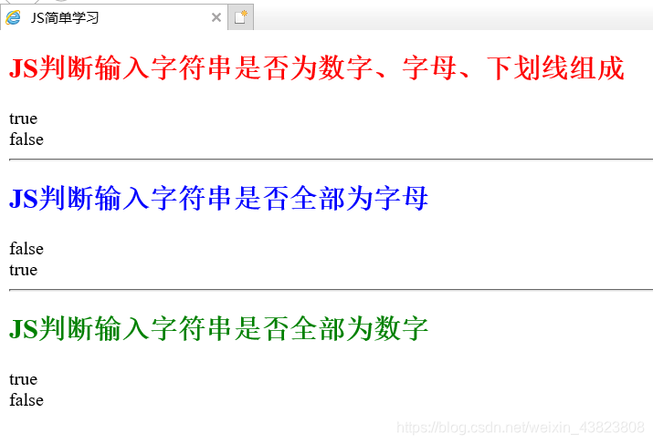 <!DOCTYPE html> <html lang="en"> <head> <meta charset="utf-8"> <title>JS简单学习</title> <style type="text/css"> .first { color: red; } .second { color: blue; } .third { color: green; } </style> </head> <body> <h2 class="first">JS判断输入字符串是否为数字、字母、下划线组成</h2> <script> function myFunction(str) { return /^\w+$/.test(str); } var str1="__123abc__"; var str2="@!999xyz"; document.write(myFunction(str1) + "<br />"); document.write(myFunction(str2) + "<br />"); </script> <hr /> <h2 class="second">JS判断输入字符串是否全部为字母</h2> <script> var s1="123456"; var s2="abcxyz"; document.write(/^[a-zA-Z]+$/.test(s1) + "<br />"); document.write(/^[a-zA-Z]+$/.test(s2) + "<br />"); </script> <hr /> <h2 class="third">JS判断输入字符串是否全部为数字</h2> <script> var num1="999888777"; var num2="China666"; document.write(/^\d+$/.test(num1) + "<br />"); document.write(/^[0-9]/.test(num2) + "<br />"); </script> </body> </html>