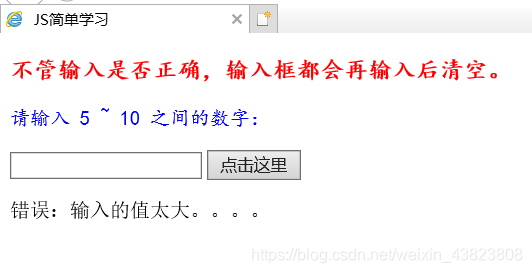 <!DOCTYPE html> <html lang="en"> <head> <meta charset="utf-8"> <title>JS简单学习</title> <style type="text/css"> h3 { color: #FF0000; font-family: "楷体"; } </style> </head> <body> <h3>不管输入是否正确,输入框都会再输入后清空。</h3> <p style="color: #0000FF; font-family: '楷体';">请输入 5 ~ 10 之间的数字:</p> <input id="demo" type="text" /> <button type="button" onclick="myFunction()">点击这里</button> <p id="demo1"></p> <script> function myFunction() { var x,message; x=document.getElementById("demo").value; message=document.getElementById("demo1"); message.innerHTML=""; try { if(x=="") throw "输入的值为空!!!"; if(isNaN(x)) throw "输入的值不是数字!!!"; //x=Number(x); if(x<5) throw "输入的值太小。。。"; if(x>10) throw "输入的值太大。。。"; }catch(exception) { message.innerHTML="错误:" + exception + "。"; }finally { document.getElementById("demo").value=""; } } </script> </body> </html>