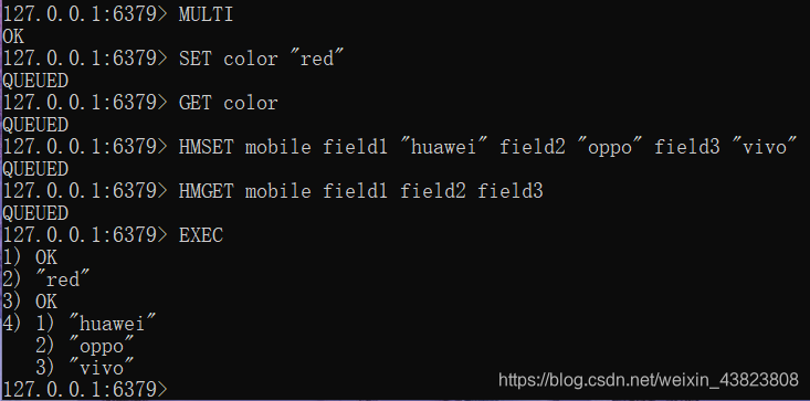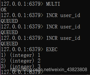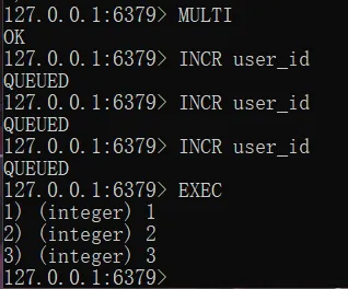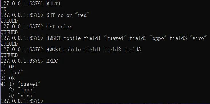 一个事务的例子,它先以 MULTI 开始一个事务,然后将多个命令入队到事务中,最后由 EXEC 命令触发事务,一并执行事务中的所有命令。