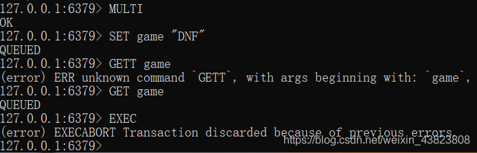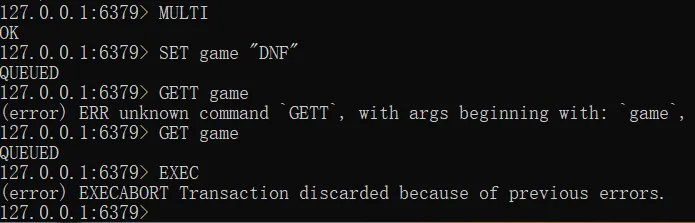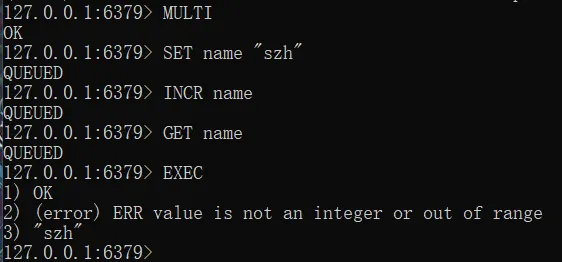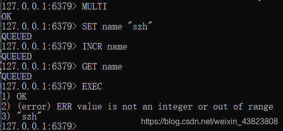 我们让一个字符串自增,也就是执行 INCR 命令,这样肯定会出现错误,但是事务的其他语句还是正常执行了 。