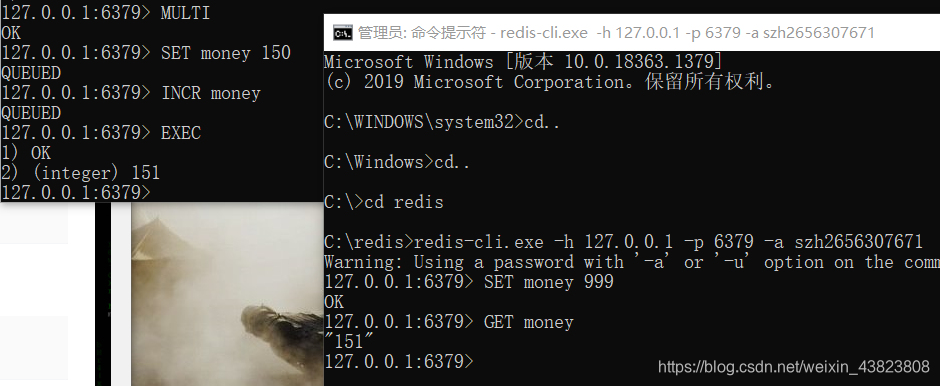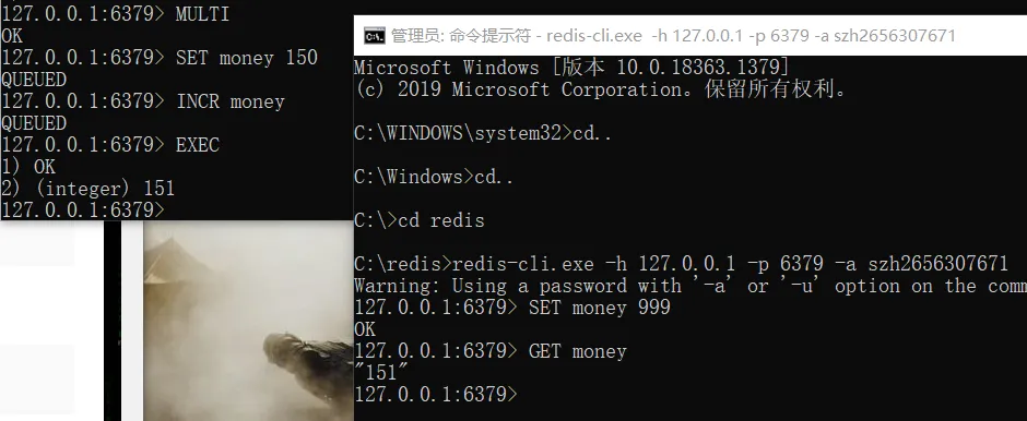 可以看到在第一个客户端中,我们设置键 money 的值为150,之后执行 INCR 命令使得 money 自增1,紧接着再执行 EXEC 命令之前,我们打开另一个客户端,对 money 设置新的值999,此时返回第一个客户端,我们执行 EXEC 命令,可以看到 money 的值并没有受到第二个客户端的影响,仍然为自增之后的结果 151。(如果想解决这个问题,就需要用到下面的WATCH命令!!!)