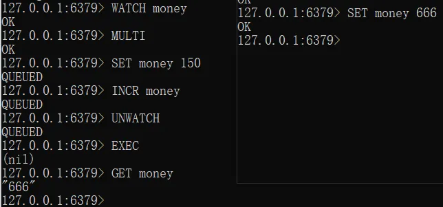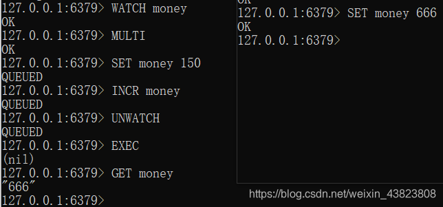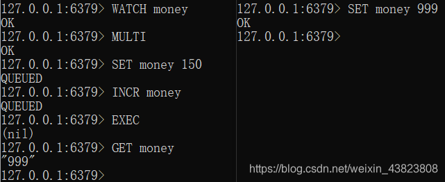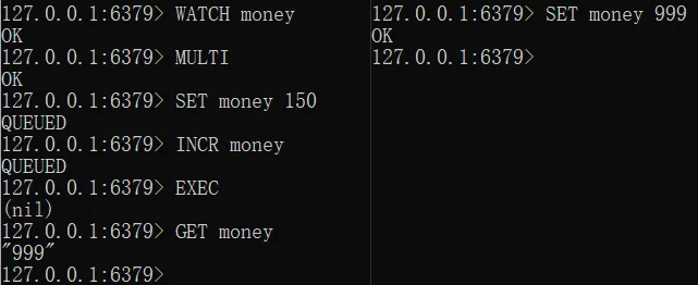 使用 WATCH 命令对 money 进行监控,则事务中执行相应的命令,由于我们对 money 进行了监控,所以 EXEC 命令返回了 (nil),而在另一个客户端中对 money 进行修改,就修改成功了,值为 999。